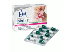 Το προβιοτικό Eva Biolact Carsules με τους ωφέλιμους μικροοργανισμούς (γαλακτοβάκιλλους) που προσφέρει, αποκαθιστά άμεσα και προλαμβάνει αποτελεσματικά τις διαταραχές της φυσιολογικής χλωρίδας του εντέρου, του κόλπου και της ευαίσθητης περιοχής της γυναίκας που μπορεί να οφείλονται σε οποιαδήποτε αιτία όπως λήψη αντιβιοτικών, κολπίτιδες κ.α.