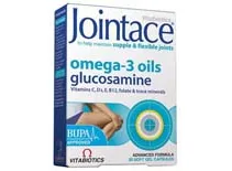 Το συμπλήρωμα διατροφής JOINTACE Omega-3 της Vitabiotics περιέχει ανά δύο κάψουλες 400mg θειικής γλυκοσαμίνης, καθώς και 400mg ιχθυελαίου και 400mg μουρουνέλαιου, έλαια ιδιαίτερα πλούσια σε ωμέγα-3 λιπαρά οξέα.