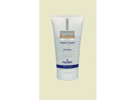 Ενδείξεις: - Πρόληψη δυσχρωμιών οιασδήποτε αιτιολογίας. - Μελαγχρωματικές κηλίδες ( age spots). - Μελαγχρώσεις προκληθείσες από φλεγμονές,ουλές φάρμακα, καλλυντικά, αρώματα. Μελέτες: - Μελέτες ασφάλειας. - Μελέτη αποτελεσματικότητας. - Challenge test. Χρήση: - Εφαρμογή σε όλη την επιφάνεια των χεριών 2-3 φορές την ημέρα. - Συνδυασμός με άλλα προϊόντα της σειράς Spot End κατά περίπτωση. - Χρήση τουλάχιστον επί 3 μήνες για ικανοποιητικά αποτελέσματα. Δράση - Ενεργά Συστατικά: - Λευκαντική δράση (Αρβουτίνη, Φαινυλαλανίνη, Αλανίνη). - Αντιηλιακή προστασία (UVA- UVB filters). - Ενυδάτωση, βελτίωση ελαστικότητας (Oleoeuropeine, Vit E, Υαλουρονικό οξύ). - Ενεργοποίηση διαδερμικής διαβατότητας (Dimethisorb).