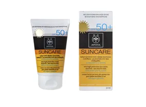 Apivita Suncare SPF 50+ κρέμα προσώπου πολύ υψηλής προστασίας για ευαίσθητες - μη ανεκτικές στον ήλιο επιδερμίδες (50 ml), με φραγκόσυκο και πρόπολη. Προστατεύει αποτελεσματικά από τη UVA και UVB ηλιακή ακτινοβολία. Εμπλουτισμένη με λυκοπένιο, πρόπολη και εκχύλισμα φύλλων ελιάς βιολογικής καλλιέργειας και φύκια, ενεργοποιεί την άμυνα της ευαίσθητης επιδερμίδας στον ήλιο και προστατεύει από τη φωτογήρανση. Το εκχύλισμα φραγκόσυκου που περιέχει, προφυλάσσει από ερεθσιμούς, καταπραϋνει και ενυδατώνει την επιδερμίδα.