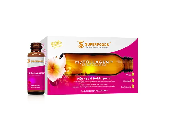 Το My Collagen της Superfoods είναι μια φυσική φόρμουλα κολλαγόνου που βοηθά στη διατήρηση της υγείας και της λάμψης της επιδερμίδας. Το κολλαγόνο είναι μια φυσική πρωτεϊνη, που περιέχεται φυσιολογικά στο δέρμα. Περιέχει πολύτιμα αμινοξέα, που είναι απαραίτητα για τηδιατήρηση του συνδετικού ιστού και την προστασία της επιδερμίδας από την γήρανση και την εμφάνιση ρυτίδων. Θρέφει το δέρμα εσωτερικά και προσφέρει σφριγηλότητα και λάμψη. Επιπλέον το My Collagen της Superfoods περιέχει ιπποφαές, εκχύλισμα grapefruit, εκχύλισμα blueberry, ολιγοσακχαρίτες και βιταμίνη C, συστατικά που δρουν κατά της οξειδωτικής δράσης των ελευθέρων ριζών και προστατεύουν την επιδερμίδα από τις εξωτερικές επιθέσεις του περιβάλλοντος και από τη γήρανση.