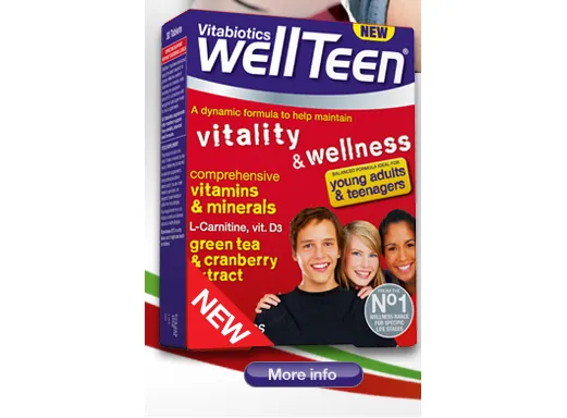 Το συμπλήρωμα διατροφής Wellteen της Vitabiotics είναι ένας μοναδικός συνδυασμός με βιταμίνες, σίδηρο, ιχνοστοιχεία, L-καρνιτίνη, εκχύλισμα πράσινου τσαγιού και εκχύλισμα cranberry, ειδικά σχεδιασμένο για εφήβους και νέους 13-19 ετών.